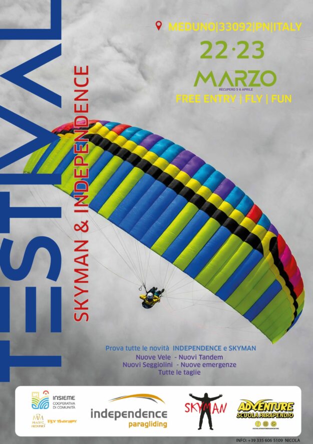 22 – 23 Marzo MEDUNO|33092|PN|ITALY FLY | FUN | FREE ENTRY Vieni a provare tutte le novità Di Skyman e Independence. Nuove vele in tutte le taglie e nuovi seggiolini per affrontare il nuovo anno con materiali nuovi e sempre all’avanguardia. Appassionato di vele da montagna da hike and Fly? tutta la gamma di parapendio…